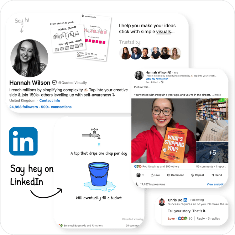 - Provide credits: clearly credit me in the caption of your post. Don't just subtly tag me. On LinkedIn this means mentioning @HannahWilson and Instagram @QuotedVisually.